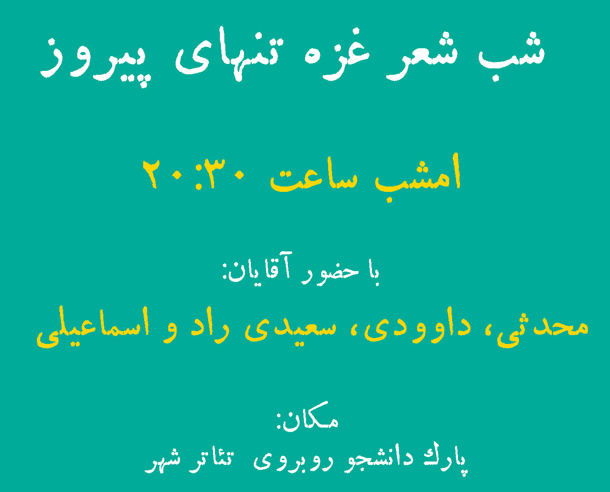 دلم برای خیمه تنگ میشود .دلم برای بچه های خیمه تنگ میشود.دلم برای خنده ها وغم هایمان در کنار هم، دلم برای غصه ها و دغدغه هایمان با هم دلم، برای تمام اینها تنگ میشود. دلم برای ابولفضل،حامد ،جواد ،دلم برای تمامی غم هامان تنگ میشود ....و تو ای غزه تو تنها ماندی ولی هیچگاه در قلب های ما تنها نماندی وتو ای غزه تا فرزندان خمینی زنده اند تنها نخواهی ماند.... وتو ای غزه پیروز بودی وخواهی بود تا انروز که بغض تمامی این سال ها را بشکنیم و پا در قدس بگذاریم ...آزاد ...بی هیچ اشک مادری بی هیچ گریه گودکی....و تو ای برادر کوچکم اینچنین بر خرابه ها زانو مزن، برخیز... که وقت ان است که شیطان را به زانو درآوریم ....
